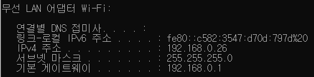 해당 주소는 명령 프롬프트에서 ipconfig 명령으로 간단하게 확인할 수 있습니다.